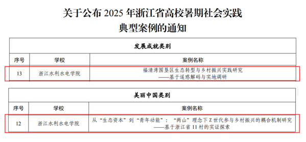 12月11日,共青团浙江省委、中共浙江省委宣传部、浙江省教育厅、浙江省学生联合会公布2025年浙江省高校暑期社会实践典型案例名单,我校2项实践成果入选。